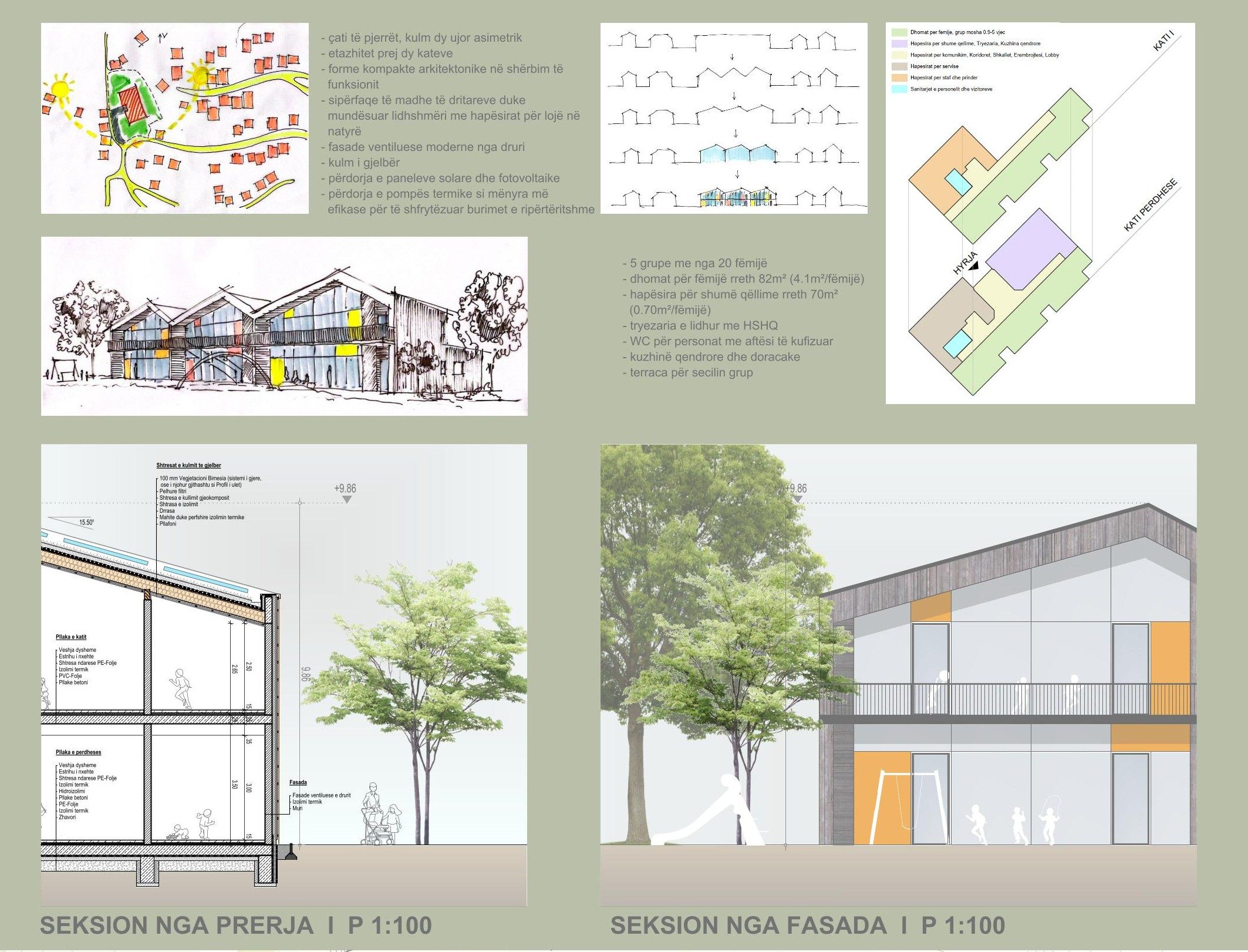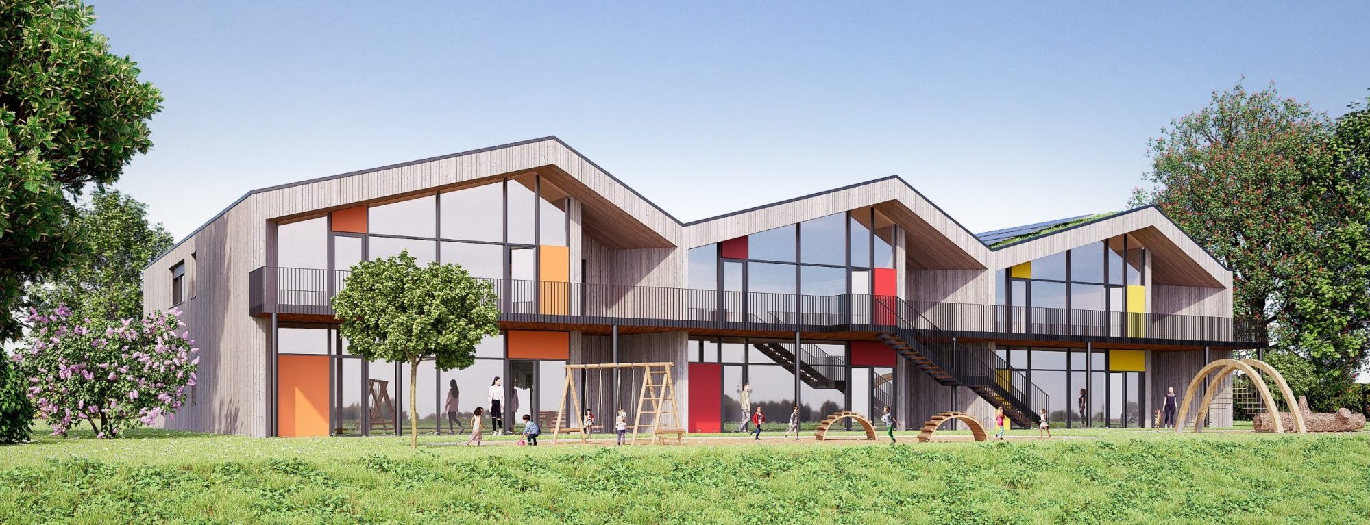 Die Einrichtung ist für 100 Kinder ausgelegt und in  fünf Gruppen mit jeweils 20 Kindern organisiert. Der architektonische Entwurf orientiert sich an der bestehenden Wohnstruktur mit niedriger Bebauung und geneigten Dächern. Das Gebäude fügt sich harmonisch in die Umgebung ein und verbindet dabei eine  moderne, innovative Gestaltung mit funktionaler Klarheit.