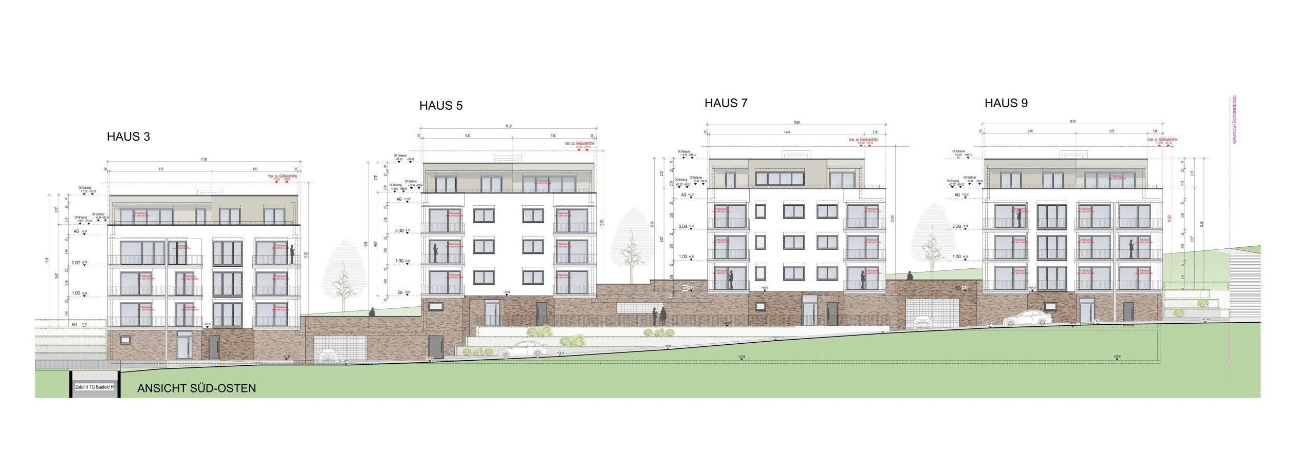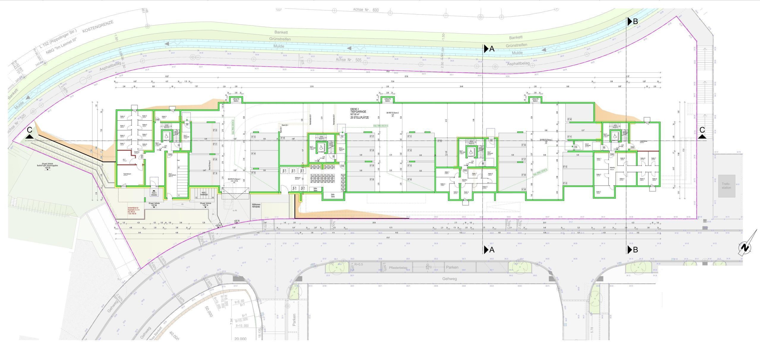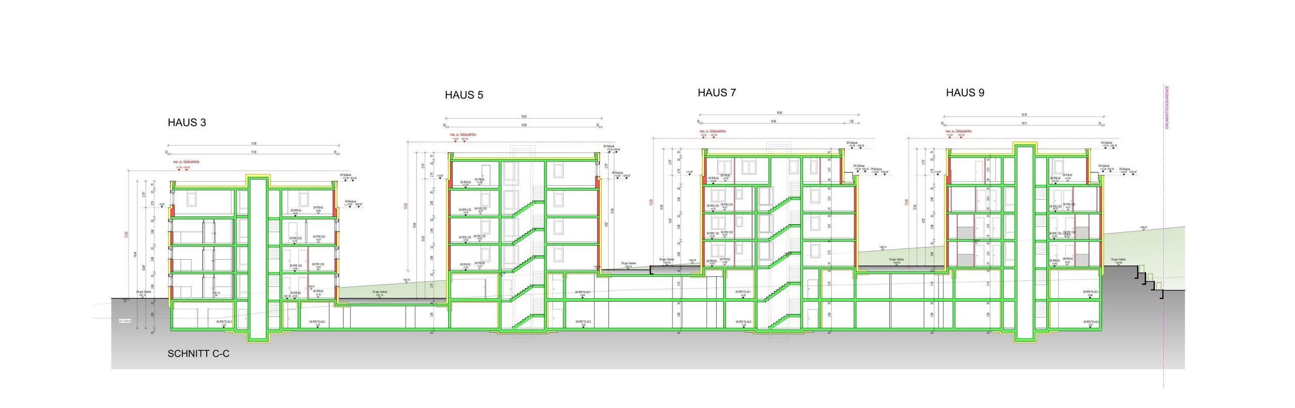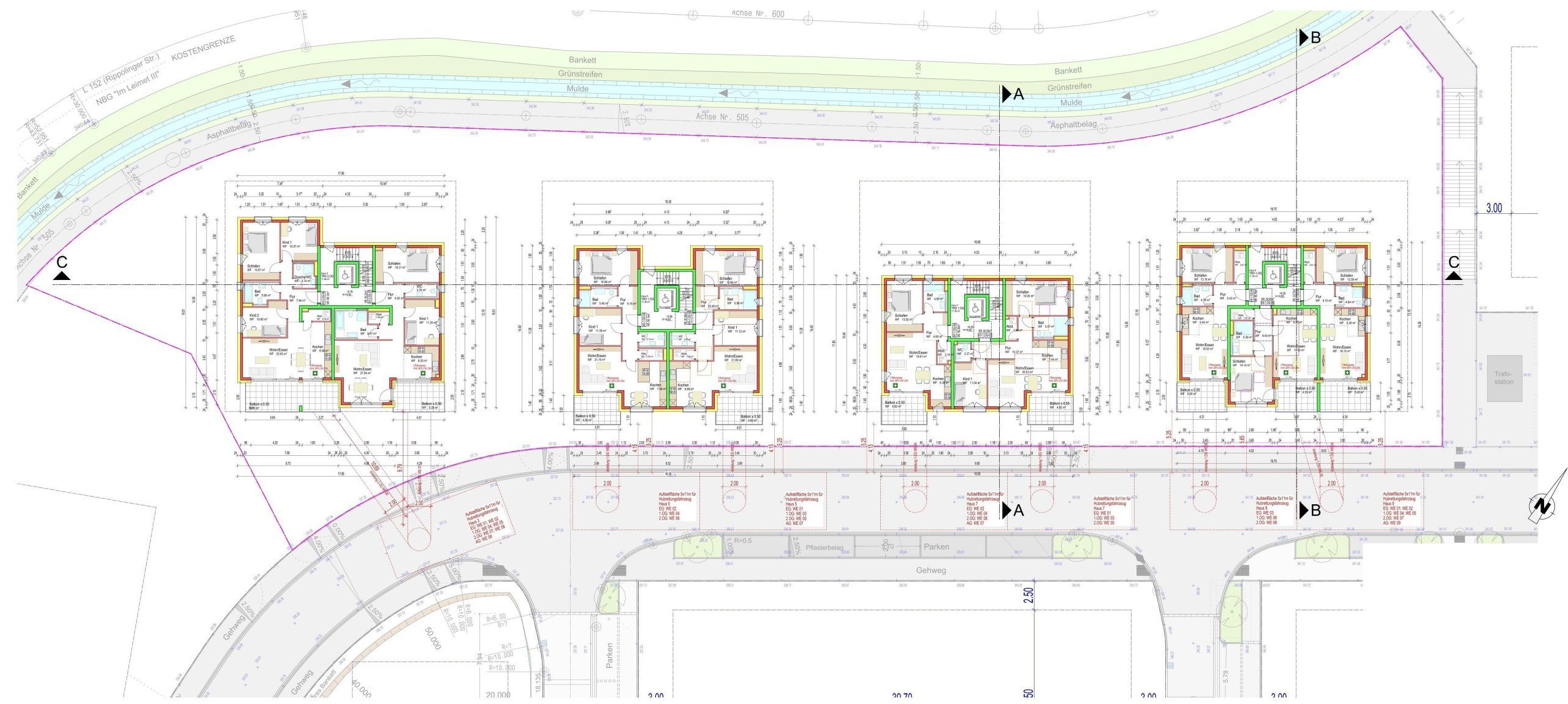 Die Erschließung aller vier Häuser erfolgt direkt von der Straßenseite. Dadurch entstehen private Gartenflächen für die Wohnungen im Erdgeschoss, die eine hohe Wohn- und Aufenthaltsqualität bieten. Ergänzt wird das Konzept durch zwei Tiefgaragenebenen, in denen der ruhende Verkehr vollständig untergebracht ist.