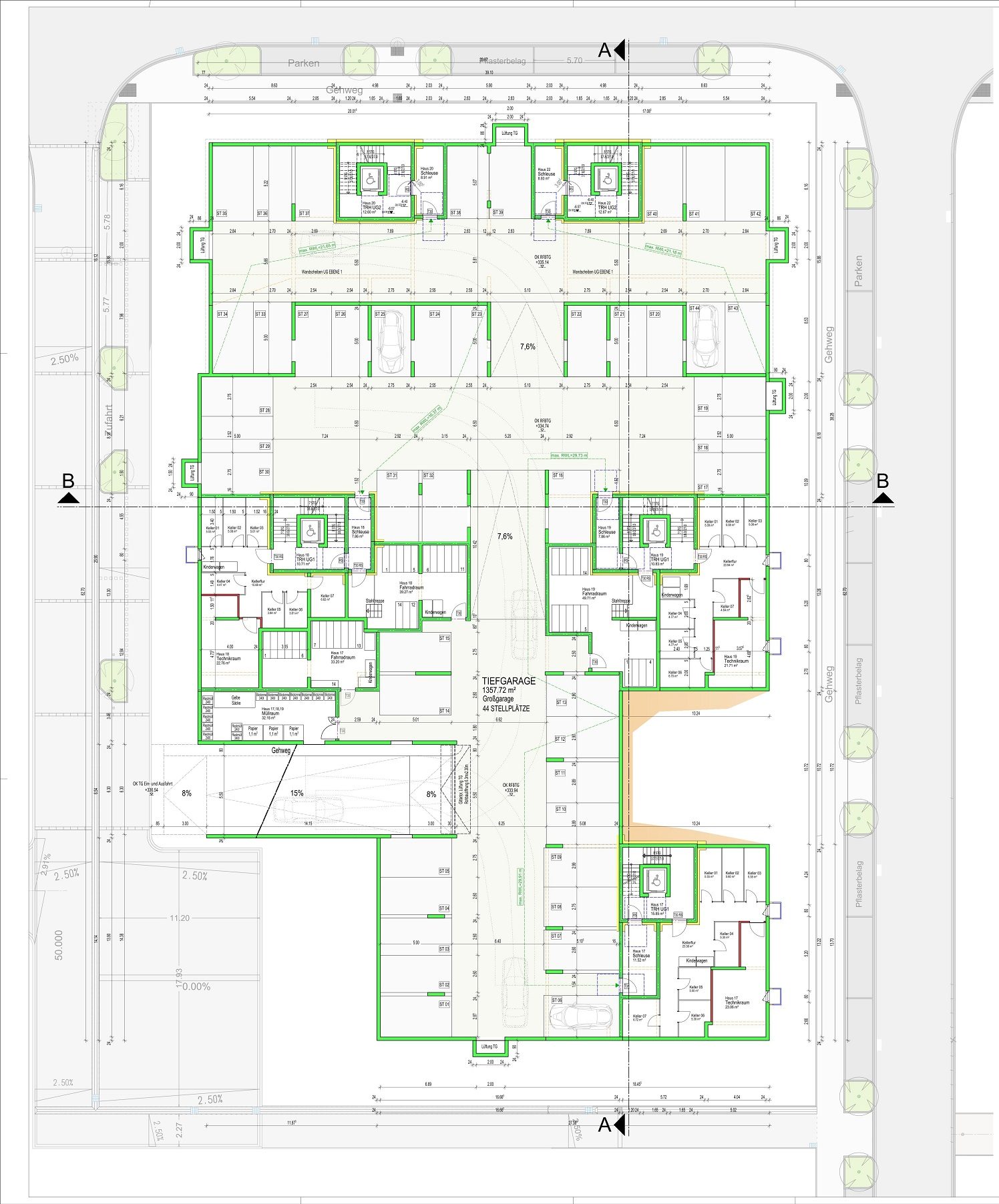 Alle Häuser sind durch eine gemeinsame Großtiefgarage miteinander verbunden, wodurch oberirdisch großzügige Grün- und Freiflächen mit hoher Aufenthaltsqualität entstehen. Die Wohnungsgrundrisse sind funktional und zeitgemäß gestaltet und bieten ein attraktives Wohnangebot für unterschiedliche Haushaltsformen.